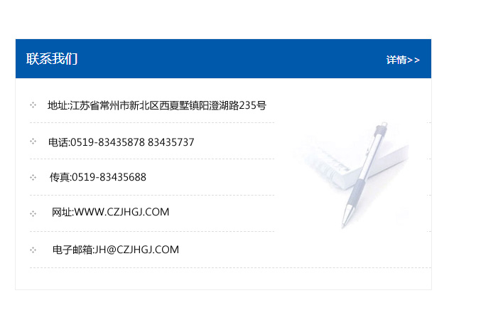 地址:常州市新北區友邦商務大廈1幢16、17層  電話:0519-85101652  傳真:0519-85112595  郵編:213022  網址:www_cz-jiayue_cn.xmkjchina.com  郵箱:xiajifengaa@163.com